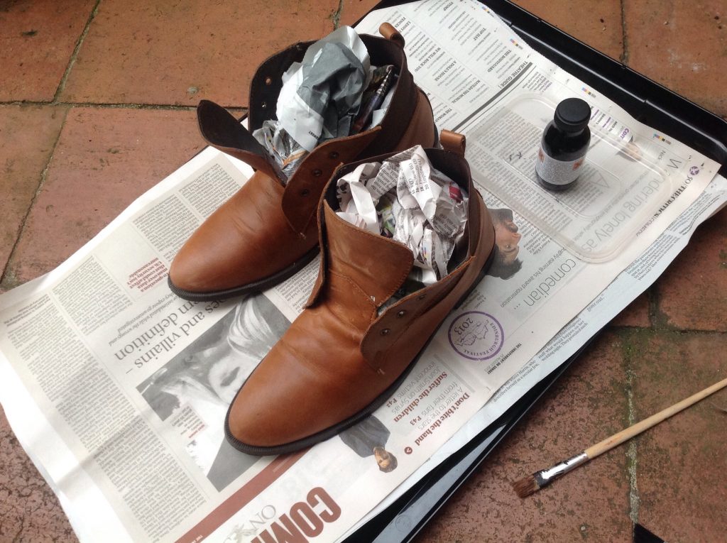 Phơi giày ở chỗ thoáng rồi đánh xi. Hãy xem sự khác biệt giữa 2 chiếc giày.